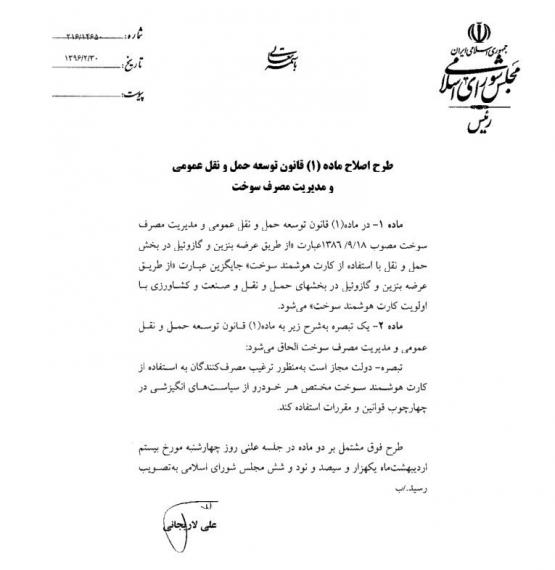 یکی از این قوانین، «قانون اصلاح ماده (1) قانون توسعه حمل و نقل عمومی و مدیریت مصرف سوخت» است که برای اجرا به وزارتخانه های نفت و راه و شهرسازی ابلاغ شد.