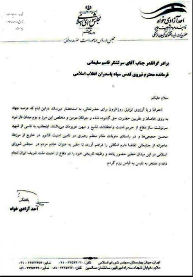 احتراما و با توفیق روزافزون برای حضرتعالی به استحضار میرساند که در این ایام که عرضه جهاد به روی خاصان و مقربین حضرت حق گشوده شده و جوانان مومن و مخلص این مرز و بوم میدان دار نبرد سرنوشتساز دفاع از حریم امنیت و اعتقادات تشیع و میهن عزیزمان میباشد اینجانب به تأسی از شهید محسن حججیها و در راستای منویات مقام معظم رهبری در تامین امنیت کشور در خارج از مرزها عاجزانه از جنابعالی تقاضا دارم امکانی را فراهم آورده تا حقیر به عنوان خادم مردم در مجلس شورای اسلامی در این میدان خطیر حضور یافته و وظیفه تاریخی خود را در دفاع از امنیت ملت شریف ایران انجام داده و مفتخر به تلبس به لباس رزم گردم.