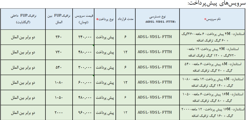 این کمپین برای تمام دسترسی های مختلف مشتریان اعم ازADSL، FTTH و VDSL و با پیشنهادات متنوع و کاربرپسند برای انواع مخاطبان اجرا می شود که شرح کامل میزان ترافیک داخلی و بین الملل، قیمت سرویس ها و جزئیات مربوط به هر کدام دردو بخش مشتریان پیش پرداخت و پس پرداخت طبق الگوهای زیر ارائه می شود