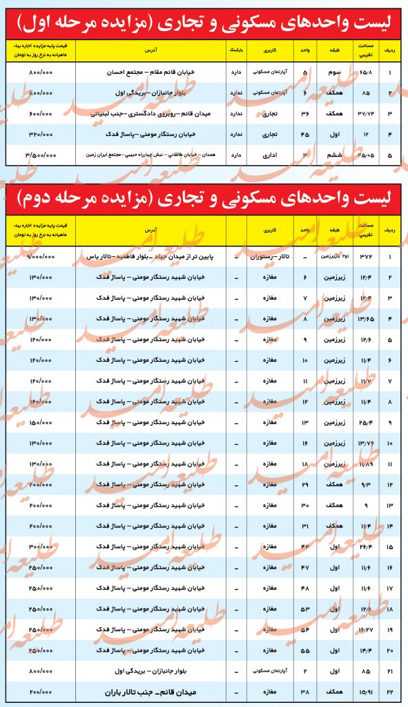 ۵-هزینه انتشار آگهی جهت مزایده و هزینه کارشناسی از برنده یا برنده های مزایده دریافت خواهد شد .