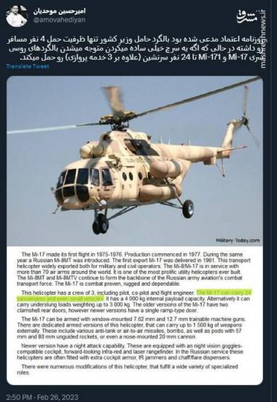 روزنامه اعتماد مدعی شده بود بالگرد حامل وزیر کشور تنها ظرفیت حمل ۴ نفر مسافر رو داشته در حالی که اگه یه سرچ خیلی ساده میکردن متوجه میشدن بالگردهای روسی سری Mi-۱۷ و Mi-۱۷۱ تا ۲۴ نفر سرنشین (علاوه بر ۳ خدمه پروازی) رو حمل میکند.