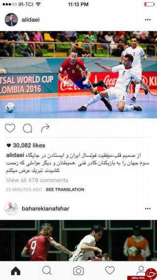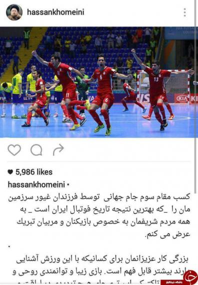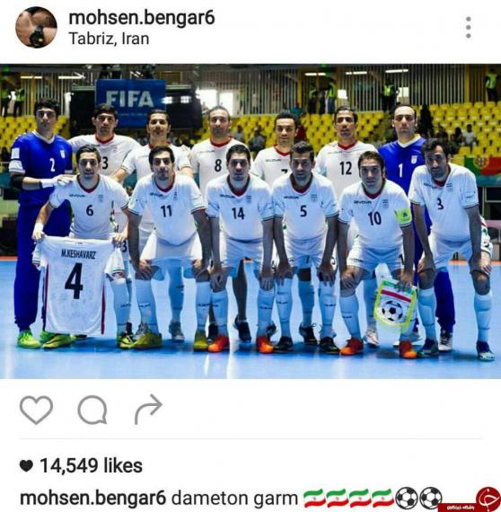 تیم ملی فوتسال کشورمان در مسابقات جام جهانی 2016 کلمبیا موفق شد با پیروزی مقابل پرتغال به مقام سومی جهان دست یابد. این اولین بار است که تیم کشورمان در مسابقات جهانی این عنوان را کسب میکند. به دنبال کسب این پیروزی دلچسب و به یاد ماندنی، ورزشکاران، هنرمندان و سیاستمداران در پیامهای جداگانهای این پیروزی را در اینستاگرام تبریک گفتند. بخشی از این پیامها را مشاهده میکنید.