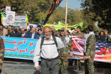 اسدی که پرچم یا حسین(ع) را با خود حمل میکند گفت: مبارزه با آمریکا و پیوری از دستورات ولایت فقیه و رهبر انقلاب همترین دلیل حضور من در این راهپیمایی است.