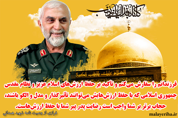 «... فرزندانم را سفارش میکنم و تأکید بر حفظ ارزشهای اسلام عزیز و نظام مقدس جمهوری اسلامی که با حفظ ارزشهایش میتوانند تأثیرگذار و مدل و الگو باشند، حجاب برتر بر شما واجب است رضایت پدر پیر شما با حفظ ارزشهاست.»