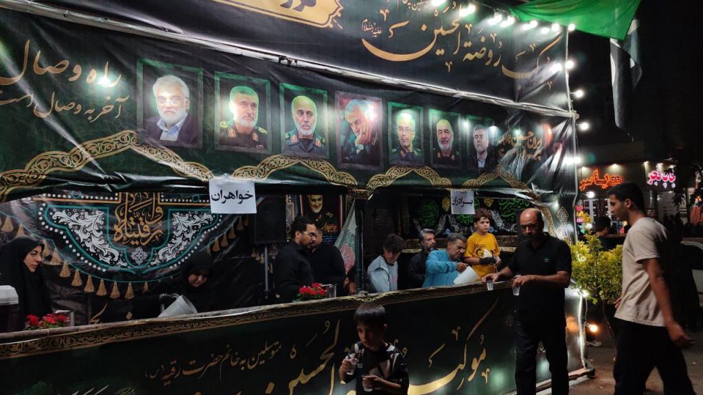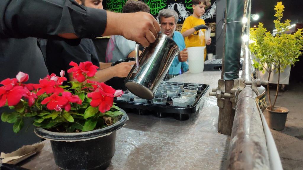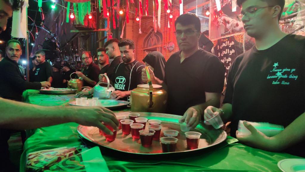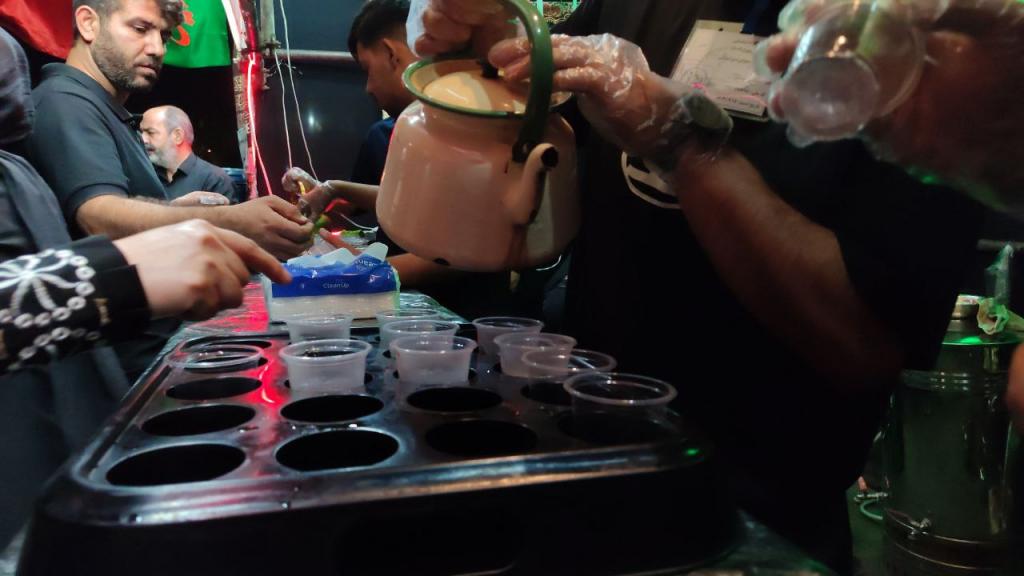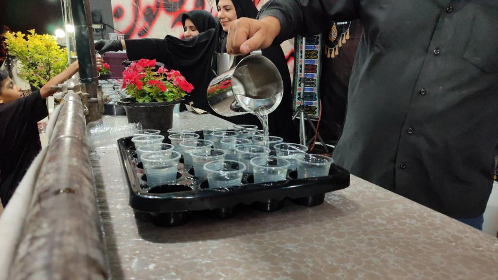 زن و مرد، جوان و پیر، دوشادوش هم، در این ایستگاههای مهر به کار میآیند. گویی هر کدام، خود را خادمی میدانند بر سر سفرهی کریمانهی امام حسین(ع). بوی نعناع و گلاب در هوا میپیچد و صدای مهربانِ بفرمایید، صلواتی گرمی بخش جانهای خستهای است که از راه رسیدهاند.